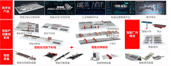 近年來,面對船舶工業(yè)轉(zhuǎn)型升級的趨勢,華工科技直擊船舶行業(yè)痛點,自主研發(fā)了高端激光切割裝備、板件賦碼裝備、激光復(fù)合焊裝備和行業(yè)數(shù)字化產(chǎn)品,并以自主裝備+自主軟件為核心,根據(jù)船舶制造企業(yè)個性化需求為其打造客制化方案,包含部件切割線、甲板切割線、型材切割線、薄板平面片體生產(chǎn)線、小組立生產(chǎn)線、T型材生產(chǎn)線等多種產(chǎn)線,并結(jié)合公司自主研發(fā)的基于AI算法的3D視覺識別分揀控制系統(tǒng)、智能總控/中控系統(tǒng)、數(shù)字孿生系統(tǒng)、工業(yè)物聯(lián)網(wǎng)平臺、制造運營管理系統(tǒng)等數(shù)字化產(chǎn)品打通生產(chǎn)全流程的數(shù)據(jù)和業(yè)務(wù),將各種船體結(jié)構(gòu)部件生產(chǎn)流程的局部效率提升轉(zhuǎn)變?yōu)檎w生產(chǎn)過程的協(xié)同和優(yōu)化,攜手船舶企業(yè)共塑新質(zhì)生產(chǎn)力。