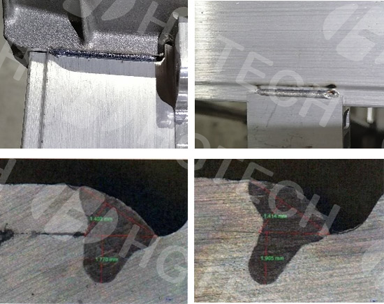 圖2是我司某客戶的鋁合金電池托盤橫縱梁焊接案例,材質為6061鋁合金,焊縫接頭形式為搭接接頭,零件均為精加工成型,尺寸狀態一致性好,若采用CMT焊接,焊后尺寸變形大,無法達到裝車要求。我司采用激光填絲熔焊進行該零件焊接,使用光束質量優異的激光器,焊接速度可達3m/min,是CMT的3-5倍,而且焊縫成型飽滿,焊接強度與CMT相當,更優的,采用激光填絲熔焊后,焊接完成的零件變形小,尺寸一致性高,可良好適配裝車需求。
