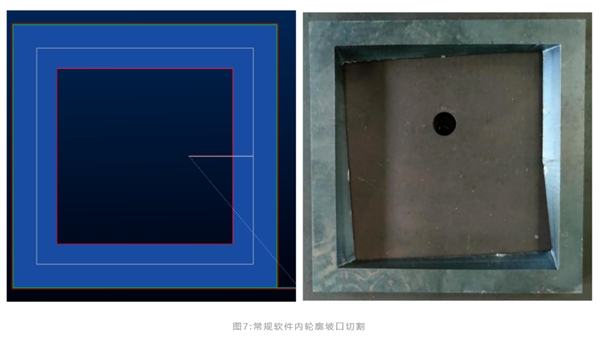 但實際切割時可以發(fā)現(xiàn),轉(zhuǎn)角處切割頭旋轉(zhuǎn)速度很慢,不能立刻旋轉(zhuǎn)到相鄰邊所需的角度,導(dǎo)致切割頭一邊切割一邊旋轉(zhuǎn),最終形成了漸變坡口的成型狀態(tài),無法滿足加工需求。實際上,內(nèi)輪廓90°轉(zhuǎn)角坡口切割一直是行業(yè)難題,因為常規(guī)軟件不能準(zhǔn)確計算出切割頭轉(zhuǎn)角運動時的G代碼,所以內(nèi)輪廓轉(zhuǎn)角切割也一直沒有得到很好解決。