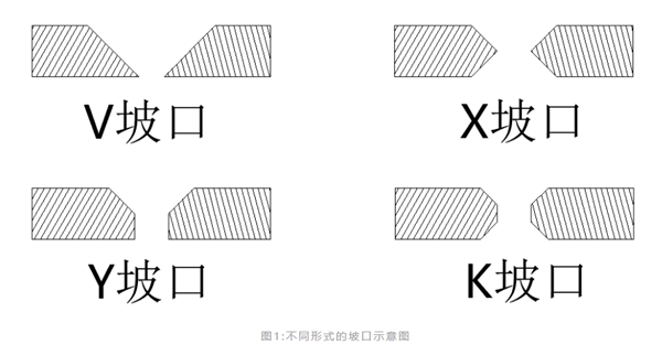 根據(jù)材料厚度和焊接質(zhì)量需求,市面上主要的坡口形式有V型坡口、Y型坡口、X型坡口、K型坡口,如圖1所示。V坡口和Y坡口是單面焊接,切割和后期焊接過程都較為便利,缺點是焊后容易變形。當(dāng)焊件厚度增大時,一般采用X坡口或K坡口,同樣厚度下可減少焊縫金屬量約1/2,對稱施焊,焊后變形小,缺點是焊接過程中要翻轉(zhuǎn)焊件,在筒形焊件的內(nèi)部施焊,需耗費一定的時間、人力成本。