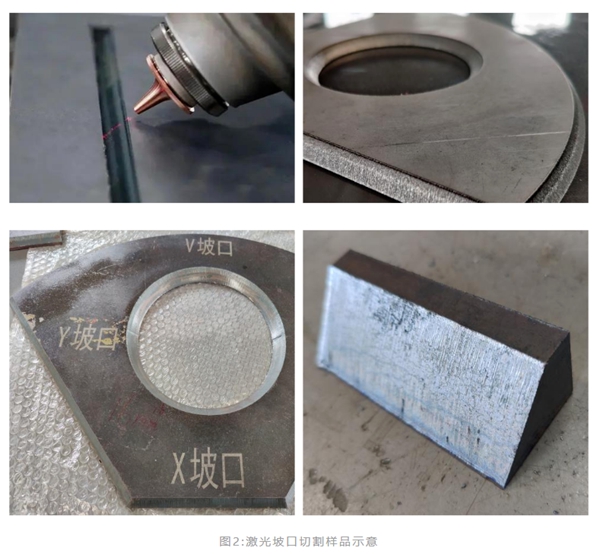 相比以上傳統(tǒng)開坡口方式,激光是目前在市場運用中熱變形最小,切口質(zhì)量最佳,尺寸精度最高并且穩(wěn)定性最好的一種新型加工方式。目前,國內(nèi)外已經(jīng)普遍采用激光切割機完成20mm甚至更厚鋼板的坡口加工,可一次成形V、X、Y等形狀的坡口,將傳統(tǒng)切割、銑削等多道工序流程一次完成,不僅可以大大提高效率、保證質(zhì)量、節(jié)約資源,并且切割零件質(zhì)量、尺寸精度較高,Y、K等形態(tài)坡口留根均勻一致,具有較高的表面質(zhì)量,如圖2所示。