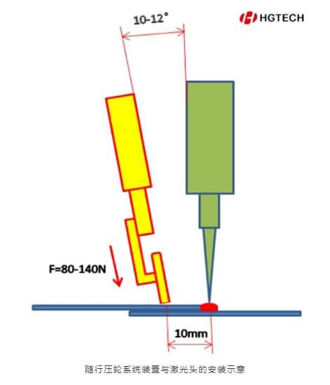 隨行壓輪系統(tǒng)裝置與激光頭的安裝角度一般為10-12°,其滾輪材質(zhì)一般為鉻鎬銅(CuCrZr)、黃銅(H65)或紫銅(T3);優(yōu)選鉻鎬銅(CuCrZr),鉻鎬銅不僅具有良好的防飛濺粘連性能,還有硬度高、耐磨的特點。滾輪距離熔池間距一般為10mm;若距離太近,熔池的高溫會灼蝕滾輪,影響滾輪的使用壽命;若距離太遠,滾輪的壓緊效果會降低,從而導致焊縫間隙難以保證。