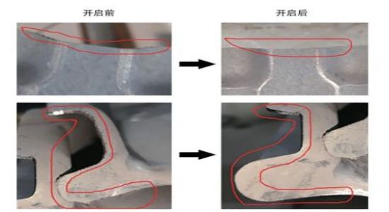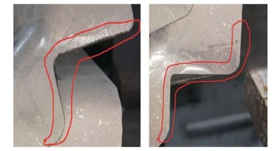 零件實際生產過程中,受熱壓回彈、投料等因素影響,工件存在不同的狀態,數模編程與實際工件存在一定誤差,是導致拐角(圖8)質量較差和燒傷的原因。