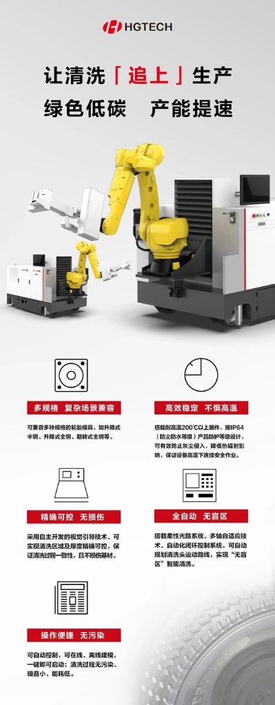 華工科技自主研發(fā)的“輪胎模具激光清洗智能裝備”攻克了激光器、清洗頭、視覺(jué)引導(dǎo)技術(shù)等多項(xiàng)核心部件與工藝,無(wú)懼高溫“烤驗(yàn)”,“不拆模”也能讓污垢一掃而光,最快45分鐘即可在線清洗一副輪胎模具,可有效解決傳統(tǒng)清洗方式中“待機(jī)時(shí)間長(zhǎng)、反復(fù)拆卸、模具磨損、清洗不徹底、環(huán)境污染、能耗高”等痛點(diǎn)、難點(diǎn)問(wèn)題,從而減少硫化機(jī)停機(jī)時(shí)間,提高生產(chǎn)效率及輪胎質(zhì)量,開(kāi)啟了輪胎模具清洗“低碳、自動(dòng)化”新時(shí)代。