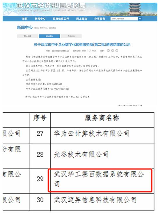 華工賽百入選“武漢市中小企業數字化轉型服務商”專業軟件服務商推薦名單