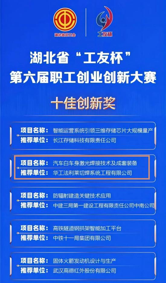近日,湖北省第六屆“工友杯”職工創業創新大賽決賽結束。華工科技核心子公司華工法利萊選送的汽車白車身激光焊接技術及成套裝備項目,獲“十佳創新獎”第二名。