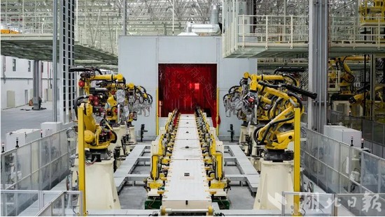 在焊裝車間,記者一眼望去,生產線上是密密麻麻的工業機器人;生產線上方,車身傳送帶縱橫交錯,科技感、機械感直接拉滿。