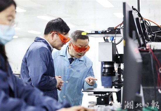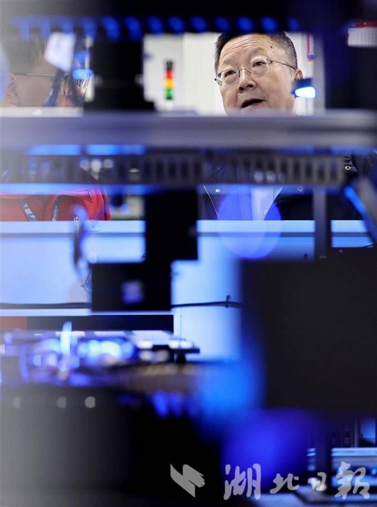 離開車間,馬新強乘車來到實驗室,換好服裝,戴上橙色護目鏡,與研發人員一起認真觀察還在實驗中的高端晶圓激光切割設備,并不時提出要求。