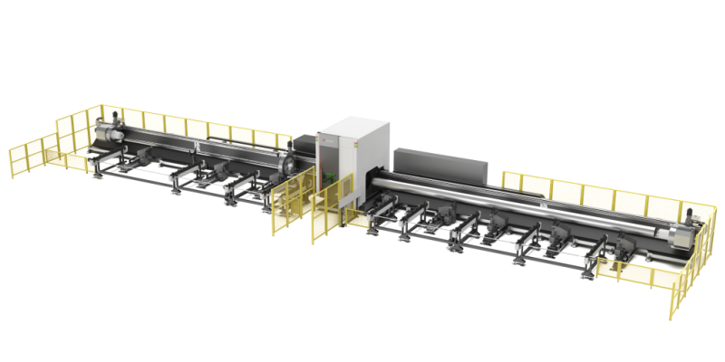 全自動伺服控制上料架、高精度超長床身、高精度回轉卡盤、浮動支撐翻板下料機構、全自動伺服控制下料架、人機工程安全防護裝置等,可實現超長超重管材的激光全自動加工生產。