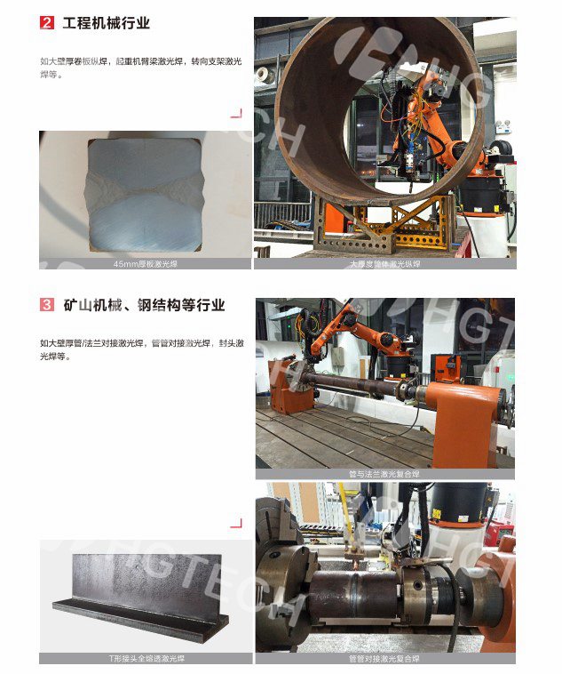 為客戶提供軌道交通、工程機械、船舶制造、鋼結構等領域中厚板的高效焊接服務。常用工藝有窄間隙厚板/超厚板激光填絲焊、激光電弧復合焊等,厚度可覆蓋5-50mm。